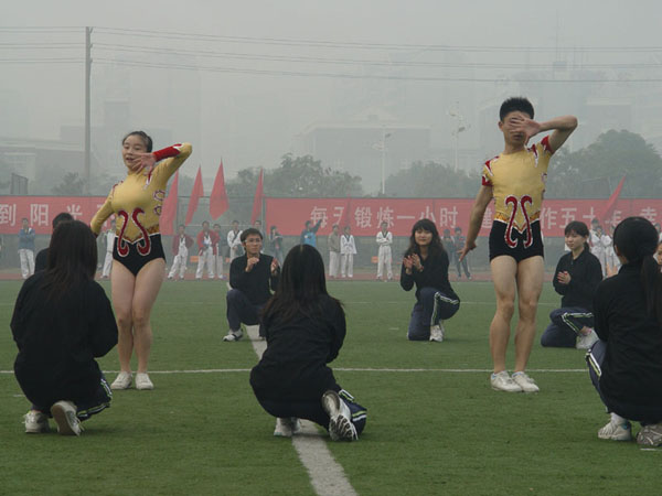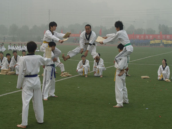 我校学生在开幕式上表演了太极拳、跆拳道、棍术、健美操体育课的教学内容,充分展示了我校体育教学的成果,也反映了我校学子以良好的青春风貌迎接奥运的高涨热情。