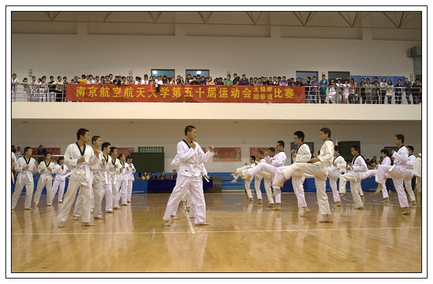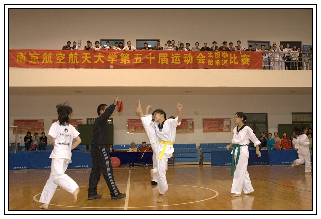 太极拳比赛结束后,紧接着进行了跆拳道的比赛。各参赛队相继登场,队员们个个精神抖擞,动作整齐划一,闪转腾挪、横踢下劈,刚劲有力,充分展现出南航学子的精神面貌和风采。最终,航空宇航学院和外国语学院获得跆拳道拳比赛的特等奖,机电学院、民航�飞行学院、人文与社会科学学院和能源与动力学院获得一等奖。