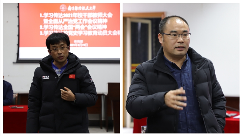 袁贵平传达了学校2021年干部教师大会暨全面从严治党工作会议精神,主要包括校党委副书记、纪委书记杭育新同志《发挥全面从严治党引领保障作用 以优异成绩庆祝建党100周年》工作报告、校长单忠德《以新应变谋新局 乘势而上谱新篇 高质量开启特色鲜明的世界一流大学建设新征程》学校工作报告、校党委书记郑永安总结讲话精神。着重传达了郑永安书记和单忠德校长的重要讲话精神,他说,郑书记的讲话和单校长的报告全面回顾总结了学校“十三五”时期学校取得的成就和2020年工作,谋划了“十四五”学校工作总体要求和目标任务,为今后较长时期学校发展指明了方向、明确了目标,催人振奋。体育部要着力提升体育育人能力,不断丰富体育教学内涵,创新体育教学方式,吸引学生爱运动、做到会运动、实现身心健康;要大力发展体育文化,通过体育课思政,弘扬体育精神,推动校园文化建设;要服务教职工身心健康,为实现“一流大学”目标作出更多贡献。