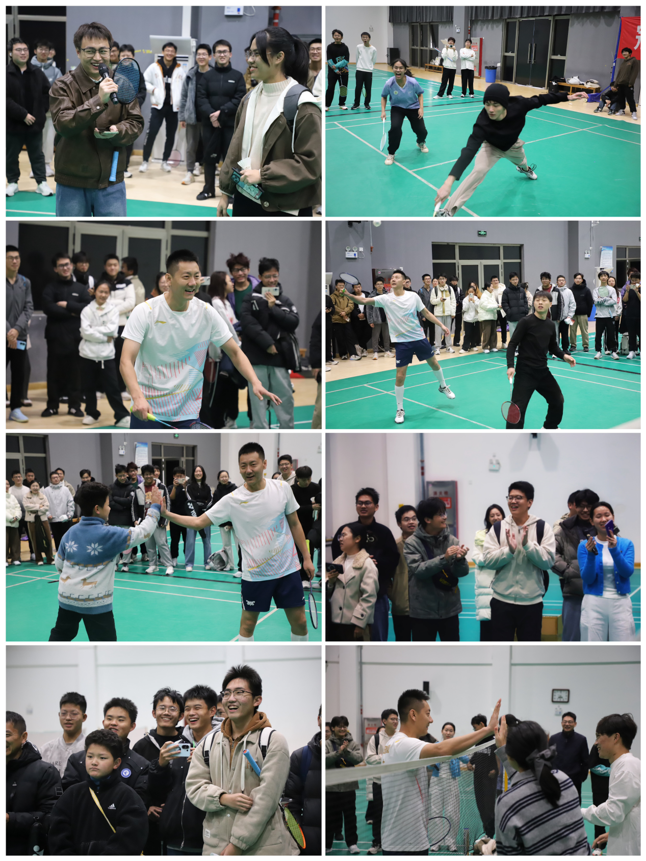 活动流程紧凑高效,专业交流与精神传承同频共振。在羽毛球知识抢答环节,题目不仅涵盖羽毛球规则、赛事常识,更聚焦陈金运动生涯中的励志瞬间。实战对抗环节成为活动核心亮点,校体育部精心设计了三轮二对二双打,与一轮一对三对打的梯度难度赛程。陈金先后与高校学子、羽毛球爱好者组队竞技,暖心搭档小朋友协同作战,最终以一对三的高强度对抗展现出顶尖竞技水准。每一场对决中,他精准的落点控制、灵活的步法移动与凌厉的进攻技巧,让师生近距离领略世界冠军的专业素养。而他在竞技中尊重对手、鼓励队友、从容应对胜负的态度,更让大家深刻体会到“更快、更高、更强——更团结”的奥林匹克精神内涵。