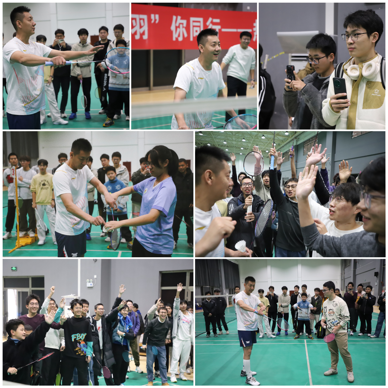 实战结束后,陈金聚焦发球、推球等基础技术要点,为现场师生提供一对一互动指导。他俯身示范动作要领,针对不同水平参与者的技术短板逐一点评、耐心纠正,用通俗易懂的语言拆解专业技巧,让师生在实操中快速提升运动能力。活动尾声,陈金亲切地与大家交流运动心得,并为热情的同学们签发了羽毛球、运动服等作为纪念,温和谦逊的态度赢得全场一致好评,活动在合影留念中定格下这场跨越专业与业余、连接榜样与传承的体育之约。