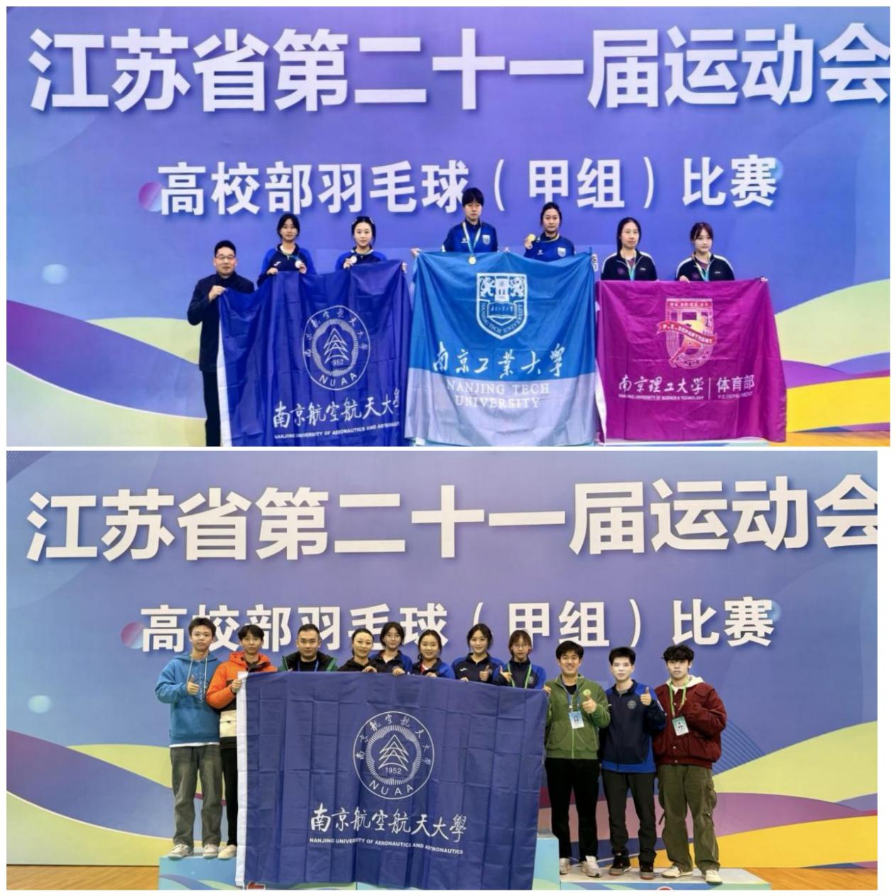 11月21日至26日,江苏省第二十一届运动会高校部羽毛球(甲组)比赛在南京医科大学江宁校区体育馆圆满举行,来自省内40余支队伍近400人参与比赛。我校羽毛球代表队在陈慧敏、张旭鹏两位教练员的带队下团结协作、锐意进取,最终获得女子双打亚军、女子团体季军、混合双打第四名、甲B组团体总分第五名,并荣获“体育道德风尚奖”,陈慧敏获评“优秀教练员”称号。