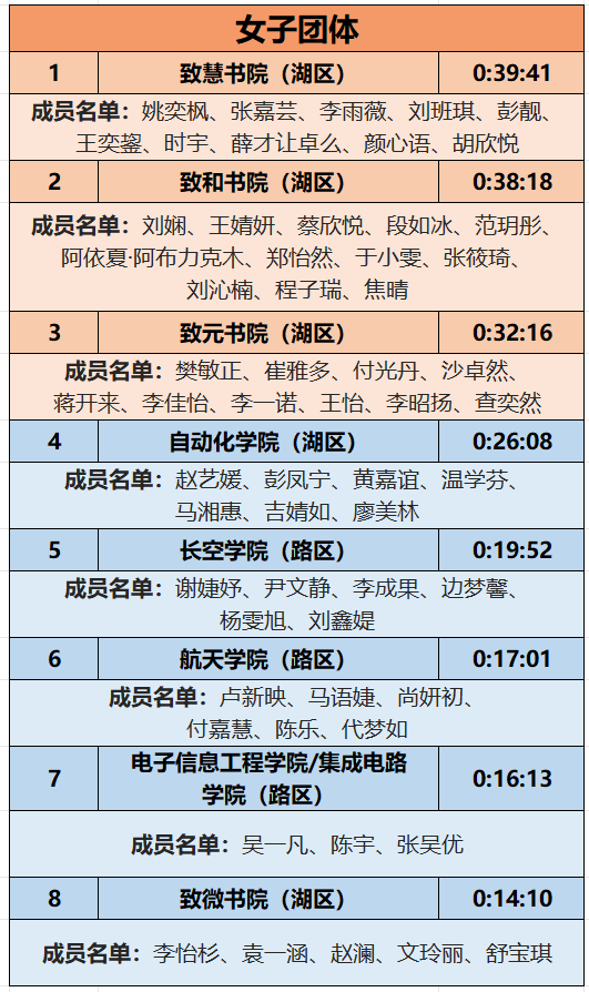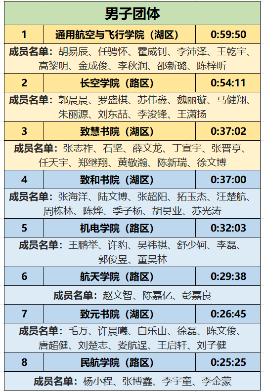 比赛现场组织规范有序,氛围热烈高涨。竞技区域内,参赛选手身姿挺拔、凝神聚力,用坚守诠释 “挑战自我、永不言弃” 的运动精神;团体接力赛中,各代表队成员无缝衔接、高效协同,将团队凝聚力转化为续航动力,上演了一场 “耐力与协作” 的精彩对决。现场助威呐喊声此起彼伏,充分展现了南航学子昂扬向上、奋勇争先的精神风貌。奖项设置凸显激励导向,为团体前三名颁发荣誉证书及奖金,充分调动了学子参赛热情。最终获奖情况如下: