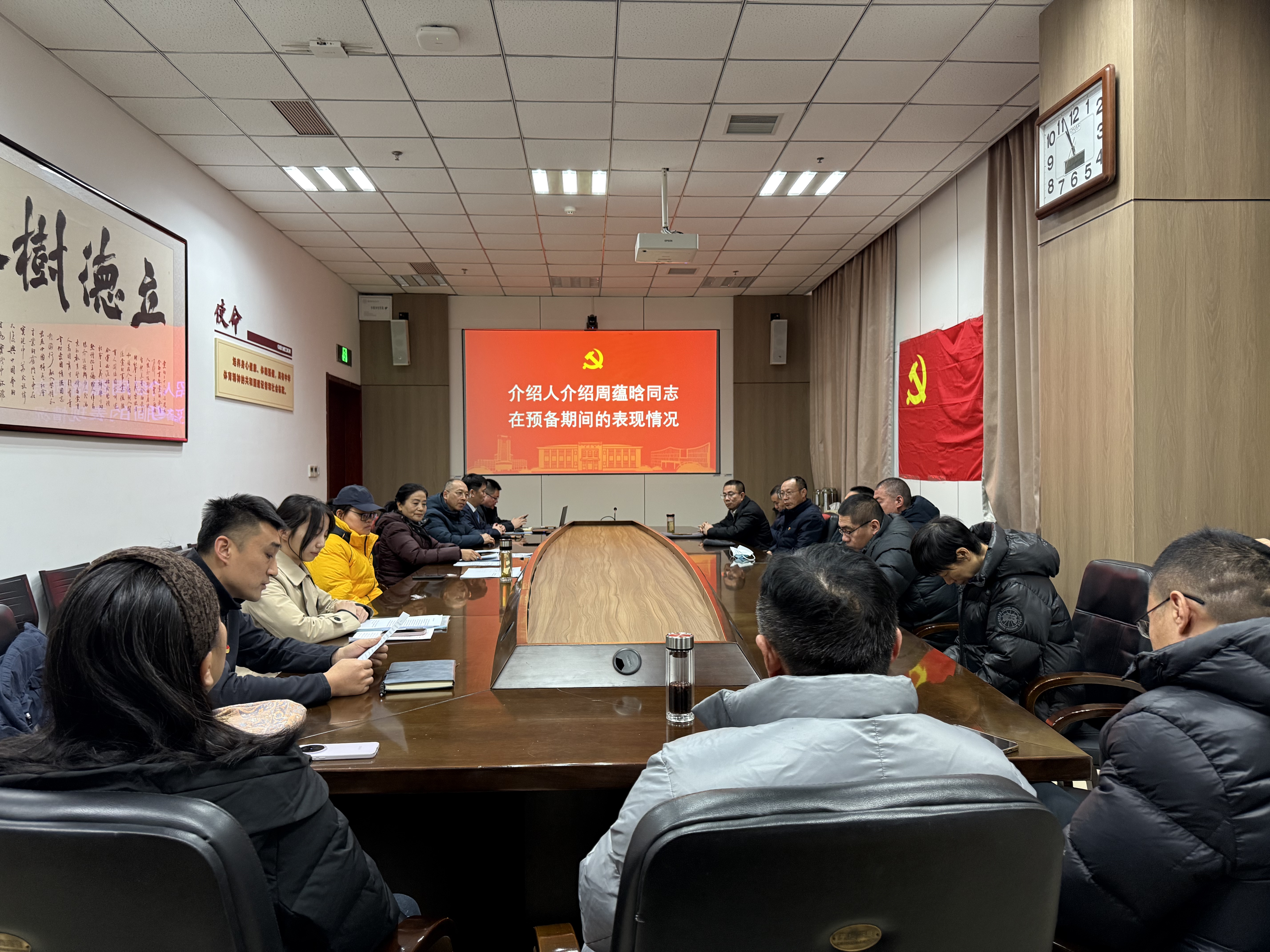 会议第二项议程对周蕴晗同志的转正申请进行讨论。首先由申请转正的预备党员周蕴晗同志向大会宣读《转正申请书》,并汇报自己在预备期间的思想、工作情况。